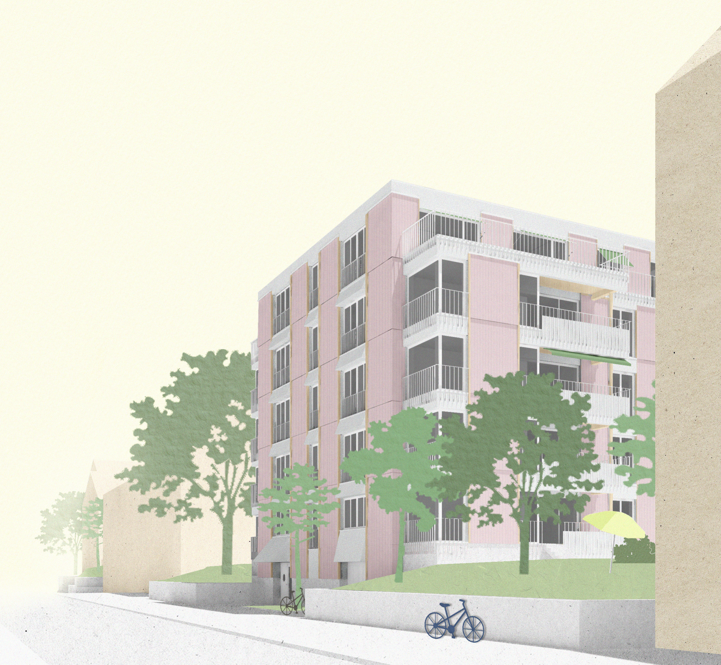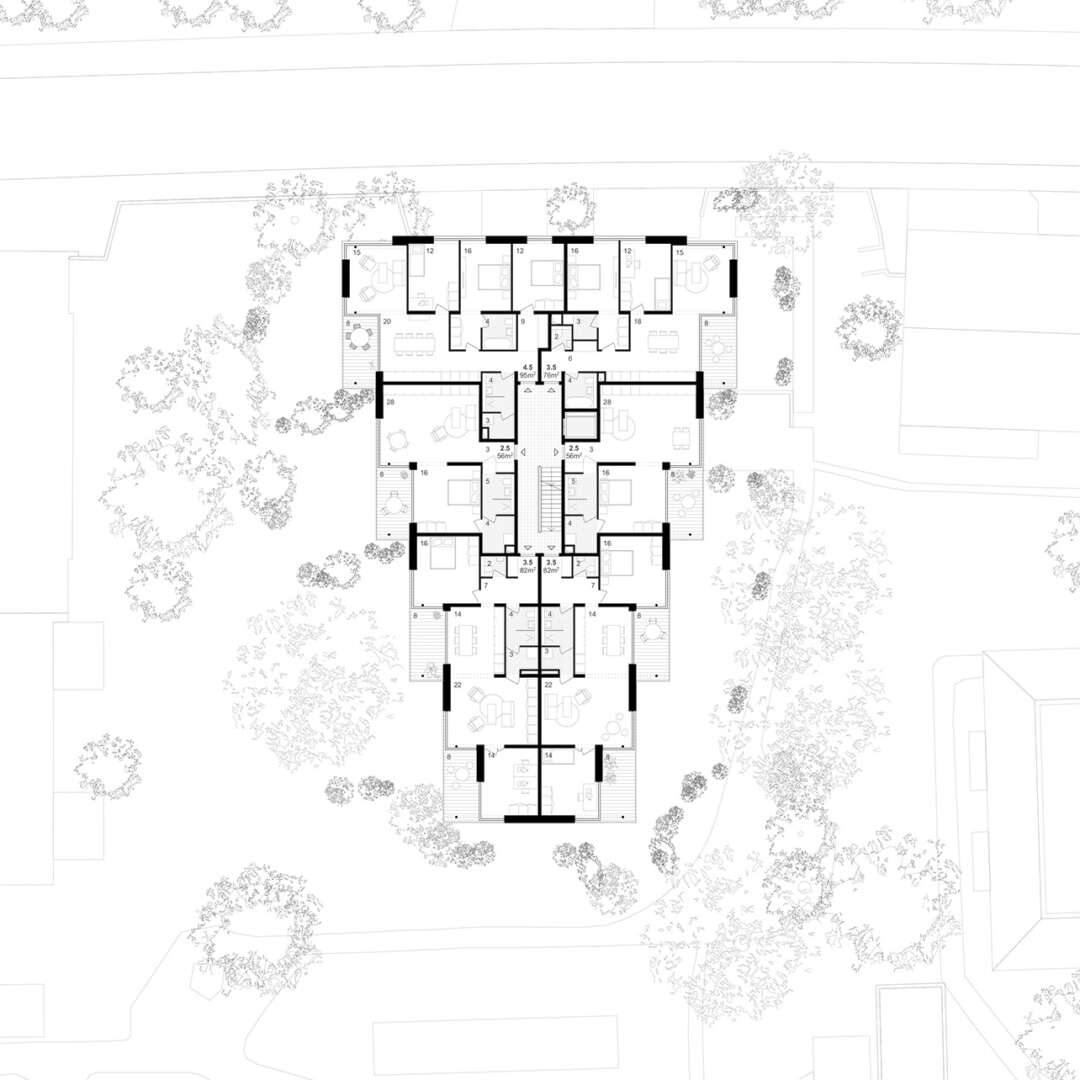 An der Magdalenenstrasse 46/48 wird ein mehrgeschossiger Wohnungsneubau mit insgesamt 29 Wohneinheiten realisiert. Das Gebäude umfasst vier Vollgeschosse sowie ein Attikageschoss und ist um ein zentrales Treppenhaus organisiert. Die Baukörpergeometrie ist an die Grundstücksverhältnisse angepasst und ermöglicht den Erhalt des vorhandenen Baumbestands. Die Gebäudefassaden zur West- und Ostseite sind nach Süden gestaffelt, was die Lastverteilung optimiert und gleichzeitig eine effiziente Belichtung der Innenräume sicherstellt. Zur Strasse hin präsentiert sich das Bauvolumen mit einer kompakten Stirnfassade, während zurückversetzte Eckbereiche die geometrische Struktur optisch auflockern und konstruktiv klare Übergänge zwischen den Fassadenteilen ermöglichen.