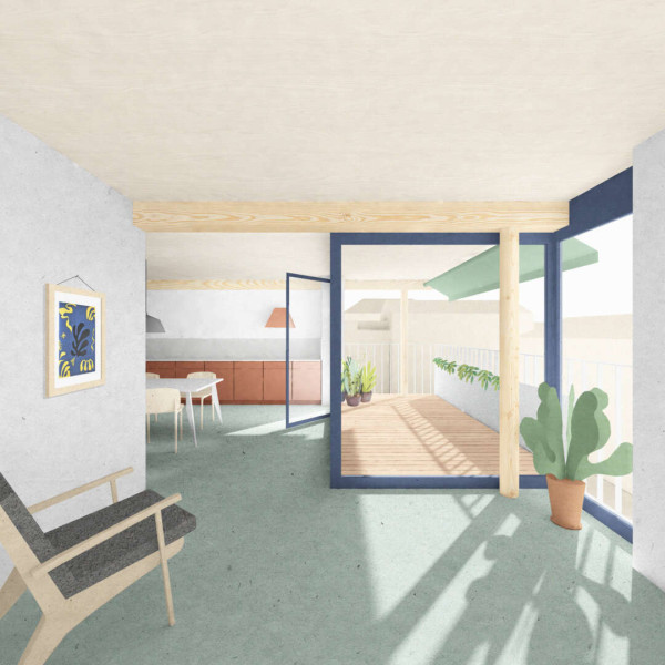 Das Untergeschoss ist in Massivbauweise projektiert. Über dem Parkhaus ist eine Abfangdecke vorgesehen, welche die Lasten des Holzbaus aufnimmt und gezielt über die Stützen und Aussenwände zur Fundation und in den Baugrund abträgt.