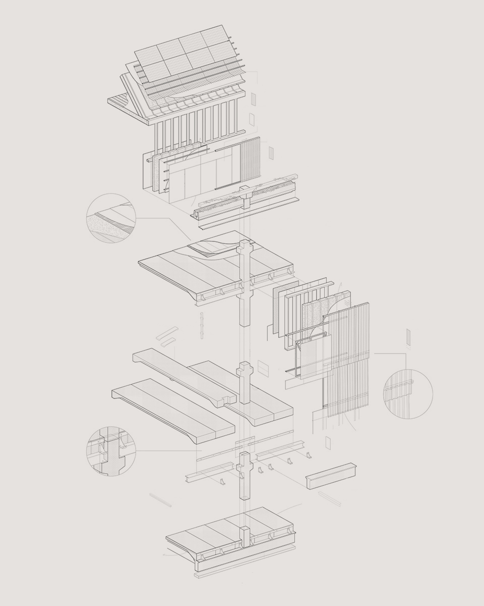 Das Tragwerk des Gebäudes ist ein Skelettbau, welcher modular aus Stahlbeton-, Stahl- und Holzelementen aufgebaut wird. Dabei kommen 85% der tragenden Elemente Bauteile aus rückgebauten Gebäuden, die in diesem Neubau wiederverwendet werden. Der Zusammenbau des Tragwerks folgt einem logischen Konstruktionsprinzip der Bauteilverbindung, welches auf geschraubten und formschlüssigen Fügungsprinzipien basiert. Der Verzicht auf gegossene und geschweisste Verbindungen ermöglicht eine einfache Montage und eine simple zukünftige Rückbaubarkeit für eine weitere Wiederverwendung. Ausserdem weist die Konstruktion einen hohen Wiederholungsgrad auf, wodurch unter anderem ein rascher Baufortschritt ermöglicht wird. Die vertikalen Lasten werden von der Struktur über Stützen, welche entlang der beiden Längsfassaden mit etwa 7.5 m Abstand zueinander stehen, abgetragen.