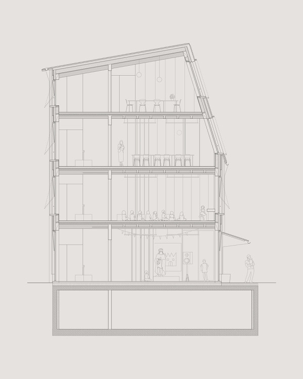 Die als Quartierschutzzone geschützte Bahnhofstrasse zeichnet sich durch solitäre Wohnbauten und markante Dachformen aus. Die asymmetrische Dachform des neuen Schulgebäudes nimmt Rücksicht auf die benachbarten Baukörper und verleiht der neuen Schule einen zeitgemäßen Charakter. Das neue Dach reagiert auf das dreigeschossige Nachbargebäude im Norden und stellt eine visuelle Verbindung zu der zweigeschossigen bestehenden Schule her. Trotz seiner subtilen kontextuellen Bezüge fügt sich das neue Gebäude mit Stolz in das geschützte Strassenbild ein.