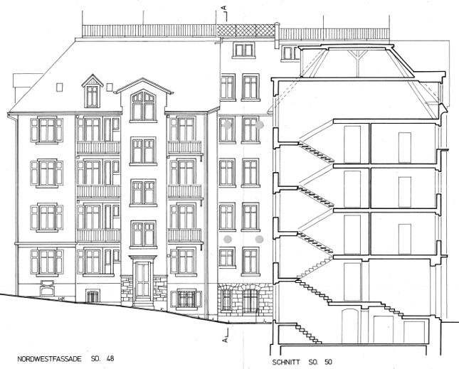 Ein Schwerpunkt lag auf der Beurteilung der komplexen Dachlandschaften der Häuser 48, 50, 52, 64 und 66. Die Mansardendächer wurden als Rafendächer mit stehenden und liegenden Stühlen erstellt. Unterschiedliche Ausbildungen, Kreuzfirste, Gauben- und Walmausbildungen und eine Stahl-Glaspyramide erzeugen ein vielschichtiges Zusammenspiel konstruktiver und architektonischer Elemente. Trotz zahlreicher Ergänzungen und Umbauten befindet sich das Tragwerk insgesamt in gutem Zustand. Auf Basis der Bestandsanalyse wurden die erforderlichen Massnahmen zur statischen Ertüchtigung definiert. Dazu zählen die Überprüfung und Verbesserung der Längs- und Queraussteifung, die Beurteilung der Zangen- und Kehlbalkenlagen sowie die brandschutztechnische Ertüchtigung der betroffenen Decken. Für Haus 48 wurden zudem die Tragreserven für den Einbau einer zusätzlichen Wohnung nachgewiesen und die notwendigen Anpassungen im Dachtragwerk festgelegt. Diese Massnahmen ermöglichen sowohl die energetische Erneuerung und Neueindeckung der Dächer als auch eine verhältnismässige bauliche Umsetzung der zusätzlichen Wohnnutzung. Mit der erarbeiteten Strategie liegt nun eine fundierte Grundlage für die weitere Planung und Durchführung der Dachsanierungen vor, die sowohl auf den Denkmalschutz abgestimmt ist als auch die heutigen technischen Standards berücksichtigt.